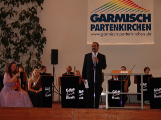 Vor über 500 Zuhörern gab das Kurorchester Garmisch-Partenkirchen sein Abschlusskonzert. Micaela di Catalano (re.) aus München trat beim letzten Konzert dieser Saison als Überraschungsgast auf. Mit ihrem klaren Sopran überzeugte sie das Publikum. Zum Abschluss spielte das Kurorchester den durch lang anhaltenden Applaus eingeforderten Radetzky Marsch als Zugabe. Die große Begeisterung der Zuhörer zeigte, wie beliebt das hiersige Orchester ist. Annemarie Laumer, von Garmisch-Partenkirchen Tourismus und der Freundeskreis des Kurorchesters gratulierten den Musikern mit Blumen. |